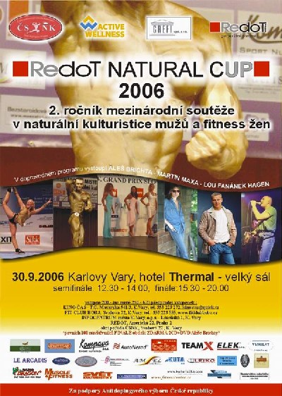 Vzhledem k četným dotazům Vám sdělujeme nejnovější informace týkající se mezinárodní soutěže v naturální kulturistice mužů a fitness žen, která se koná dne 30. 9. 2006 v Karlových Varech ve velkém sále hotelu Thermal pod názvem REDOT NATURAL CUP 2006. V souvislosti s nárůstem počtu kategorií i bohatého doprovodného hudebního programu jsme se rozhodli pro změnu časového harmonogramu soutěže, neboť by již bylo problematické zvládnout vše v původně plánovaném čase. Pro ty, kdo přijedou fandit máme dobrou zprávu, že se nemění původní cena celodenních vstupenek, která zůstává v předprodeji 200Kč, na místě 250 Kč a jsou platné pro semifinále i finále. Navíc prvních 100 příchozích diváků na finálovou část obdrží od pořadatelů akce zdarma nejnovější 2CD nebo DVD Aleše Brichty Divadlo snů v hodnotě 450 Kč !!! Předkládáme Vám aktuální verzi časového harmonogramu této nejvýznamnější soutěže ČSNK v roce 2006. REDOT NATURAL CUP 2006